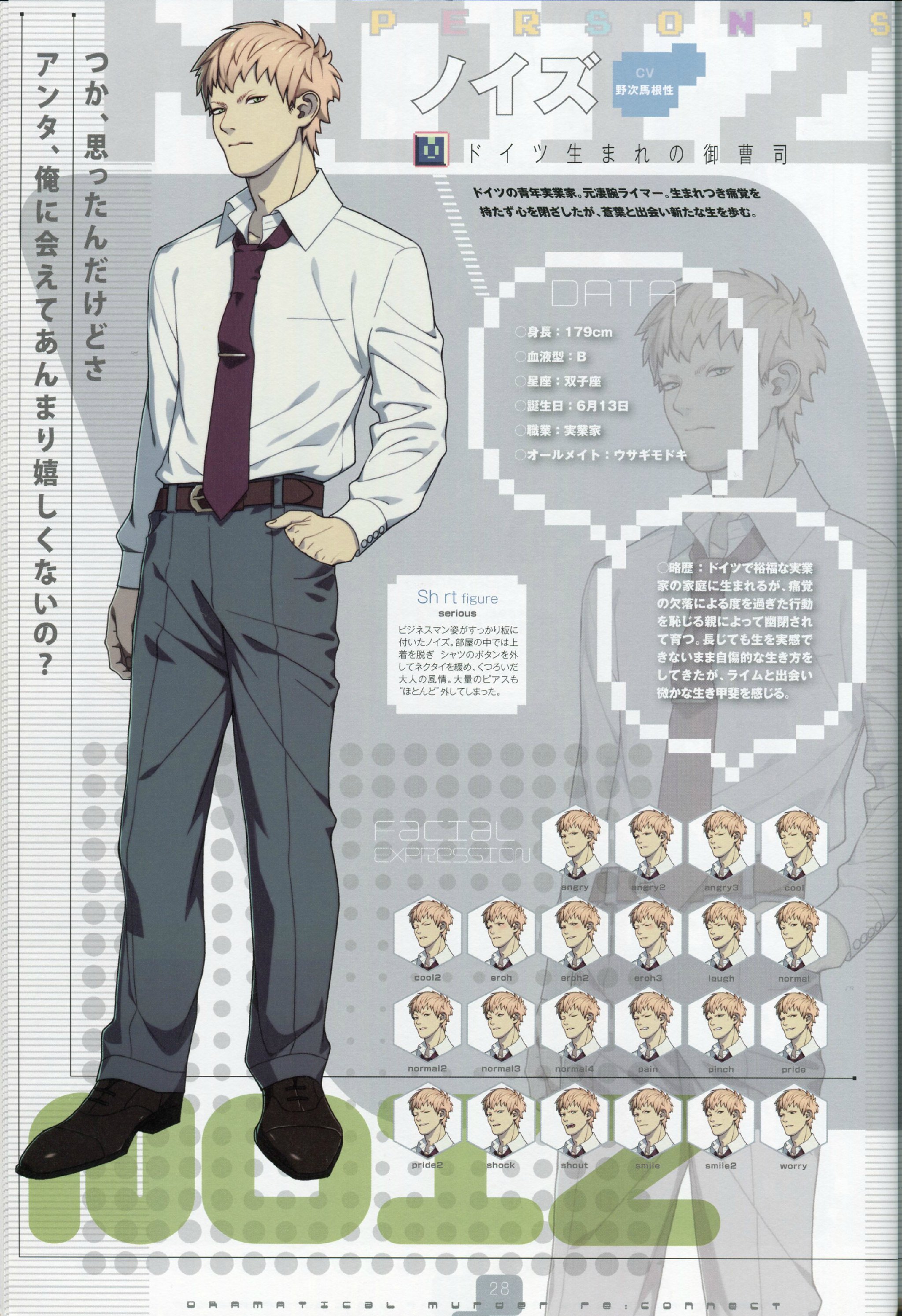 Noiz was born as Wilhelm (Wim for short) in Germany unable to feel pain. He got into fights with other kids often because he didn't understand the pain they felt wich led to him having trouble at school and eventually his parents took him out of school and kept him in a spare (apartment sized room) in their home wich is always depicted as dark with one door. He was cut off from the world by his parents and harbors both resentment and guilt towards them. He also had a brother, Theo who he had a good relationship with before being locked away although his parents didn't want them to have contact because they didn't want Noiz rubbing off on him. They do recconect in Noiz's good route where after Aoba beats him at Rhyme he goes back to Germany for three months to talk to his brother again and start working at his parents company. He has 26 peircings, one gauge in his right ear lobe an industrial peircing three lobe piercings a gauge and a tragus in his left ear a birdge piercing two snake bights two eyebrow piercings a tongue piercing two at the base of his neck one navel piercing 2 on his left hand 3 on his right hand and 4 freaky ones! The only one that hurt was his tongue because that is the only place he can feel anything and he found it interesting to feel how other people felt. All he'd longed for was to feel like everybody else, because his innability to feel pain served as a social barriar when he was young. He plays Rhyme because it simulates pain and it makes him feel human. He becomes obsessed with fighting Sly Blue which is why he ganks (enters a Rhyme battle with someone who doesn't have a choice in it The Usui isn't there and the pain scaling doesn't work so losing could mean dying(see my page about Rhyme here)) Reason while he is delivering a part for his job. He then breaks into Aobas house to try and figure out his Rhyme stratagies. He is also facinated by Aobas allmate Ren. Most of his time seems to be spent on Rhyme he deals Rhyme intelegence for a living and it because his reason for living when he felt hopeless after leaving Germany. He doesn't know the names of many foods because he wants to just eat pizza and pasta for the rest of his life. In Noiz's good route his scrap session is successful and he ends up in the hospital for a while. After he gets released he plays Rhyme with Aoba and after losing moves to Germany to recconect with his brother and "get his shit together" he took out his piercings and took off his swag. Then he goes back to Japan taking Aoba with him to Germany despite the small homophobic childs protests In Noiz's bad ending the scrap session goes bad trapping him and Aoba in the room of his mind where every touch is pain where he is finally happy and our dear Yaoi Jesus is left to suffer.